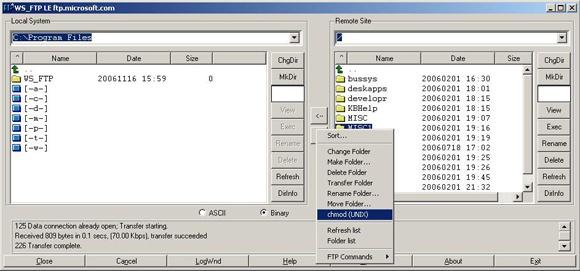 1. Wenn Sie mit WS_FTP Lite eine Verbindung zum Server hergestellt haben, klicken Sie im Serverfenster (rechte Hälfte) die zu ändernde Datei, mit der rechten Maustaste und wählen „chmod (UNIX)“.