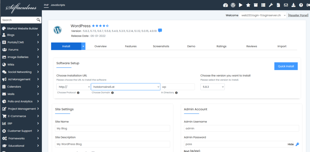 2. Klicken Sie in der Navigation rechts oben auf "Softaculous":