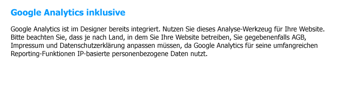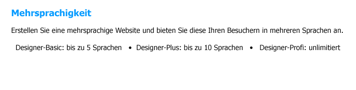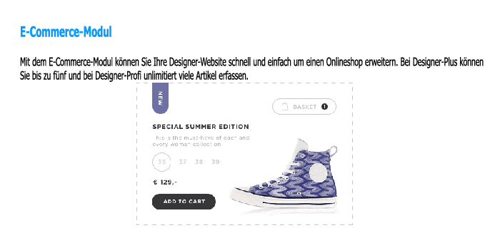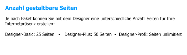 Das Paket Designer-Profi enthält alle Features, die man für eine Homepage braucht. Erstellen Sie in wenigen Schritten Ihre eigene professionelle Webseite ganz ohne Programmierung. Mit dem e-Commerce-Modul können Sie Ihren eigenen Online-Shop betreiben und können unlimitiert viele Artikel erfassen. Ihre Webseite wird auf allen mobilen Geräten perfekt angezeigt. |