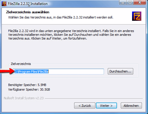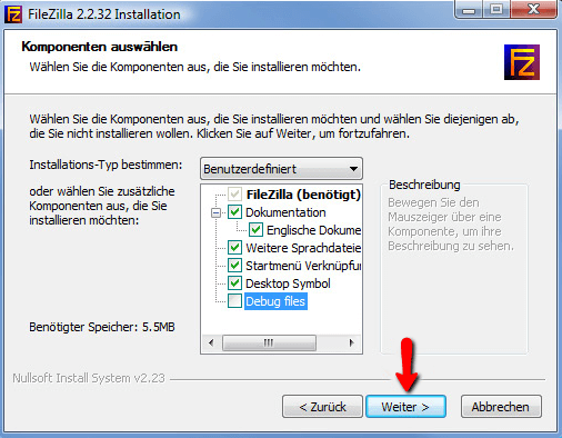 4. Wenn Sie eine Verknüpfung für FileZilla im Startmenü möchten, können Sie in der nächsten Maske auf „Weiter“ klicken.