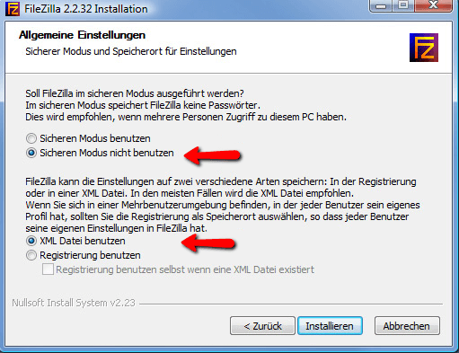 Anschließend können Sie Einstellungen bezüglich der Sicherheit und der Speicherung der FileZilla Einstellungen vornehmen. Die Einstellungen auf der Abbildung werden empfohlen. Klicken Sie anschließend auf „Installieren“, um die FileZilla Installation zu starten. Wenn diese abgeschlossen ist, klicken Sie auf „Beenden“, um die Installation abzuschließen.